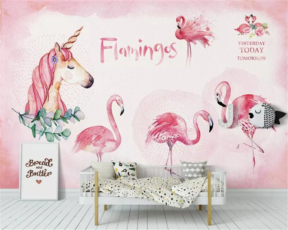 Beibehang Wallpaper Kustom 3d Kartun Flamingo Merah Muda Unicorn