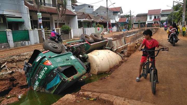 Truk Molen Tercebur Kali Rusak Bangunan Warga Perumahan Pbi