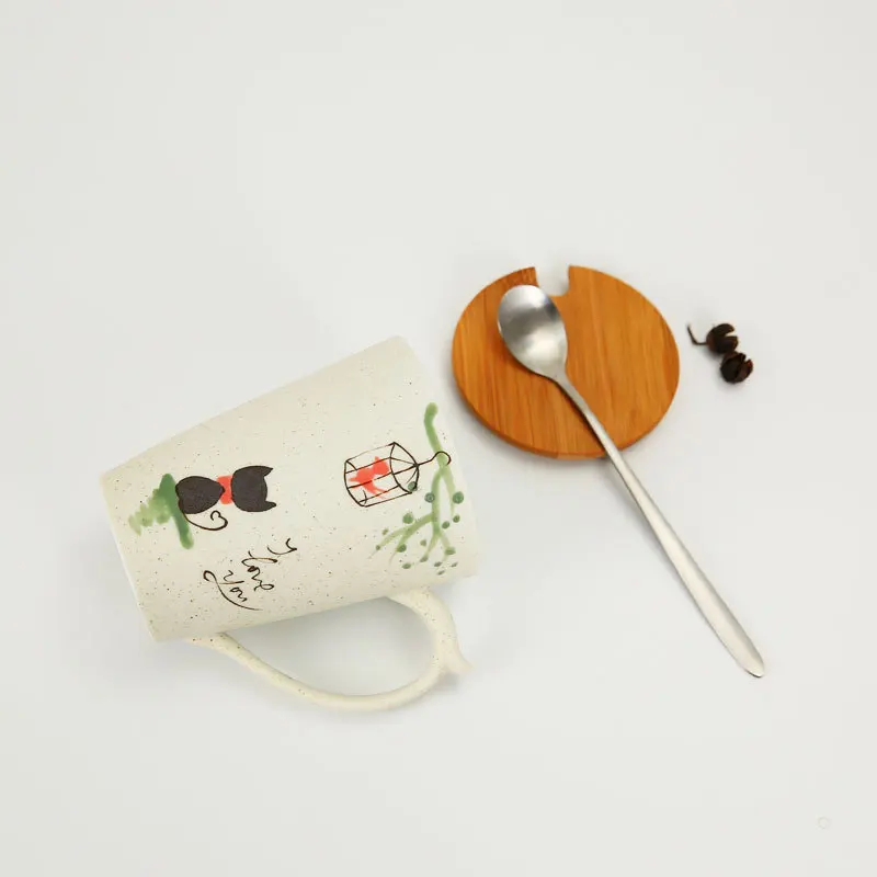 Tangan Gambar Kartun Kucing Pola Keramik Pagi Mug Dengan Tutup Dan