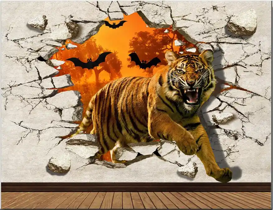 3d Ruang Wallpaper Kustom Foto Harimau Sengit Memecahkan Dinding
