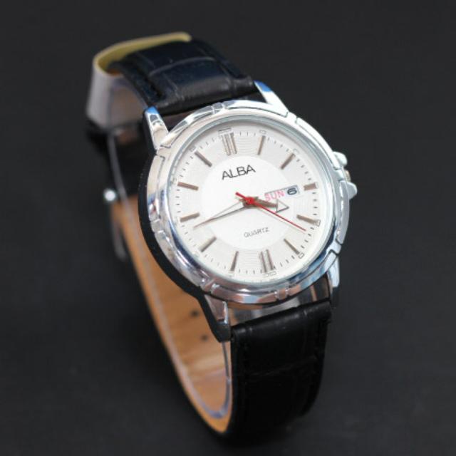 Alba Tanggal Hari Leather Kulit Hitam Plat Putih Jam Tangan Pria