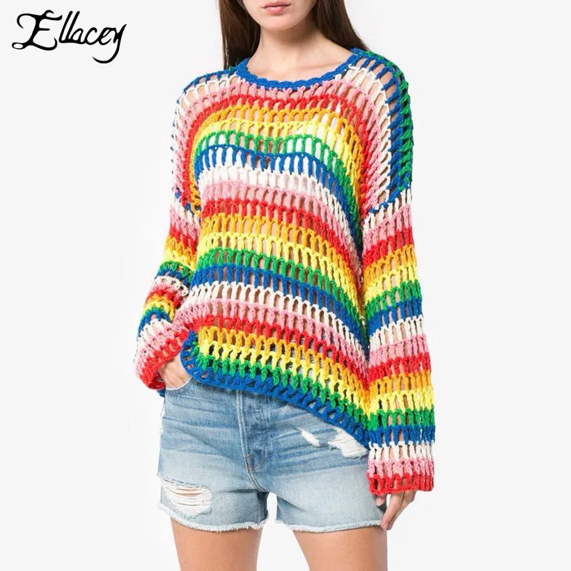 Ellacey 2018 Pelangi Berwarna Warni Sweater Wanita Hollow Keluar